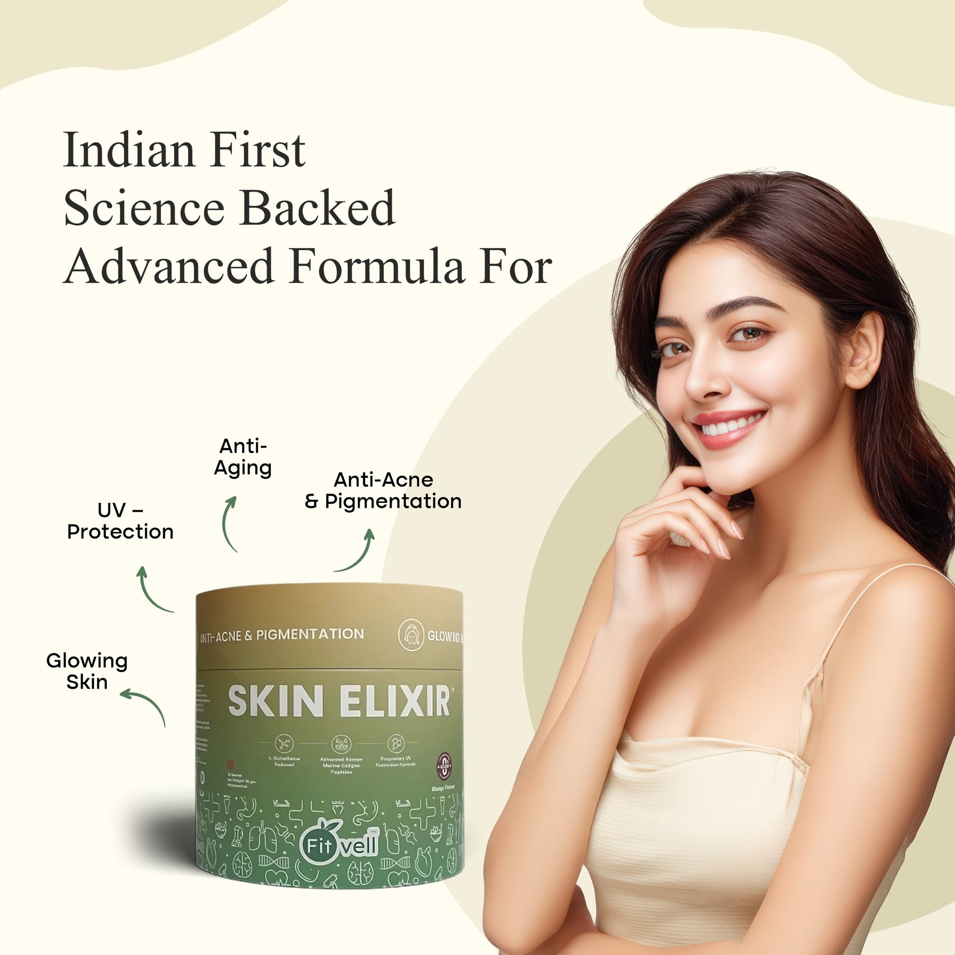 Skin Elixir is a proprietary formula packed with potent ingredients like L-Glutathione, Advanced Korean Marine Collagen Peptides, Proprietary UV-Protection formula, Vitamin C, Vitamin E, Hyaluronic Acid & Biotin.